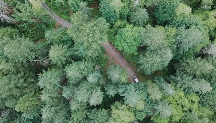 Top View Footage Of A Vehicle Passing By The Road In The Forest (Copy)
